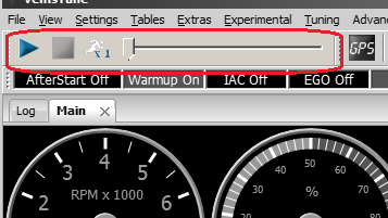With this tool you can play back the data of a VemsLog file. If you can not see this tool after opening a log file it means this tool is not added to the toolbar. To do this, open View / Toolbars submenu and check Replay on log to make the tool be visible