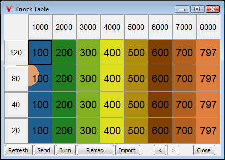 • If desired you can fill area where knock detection is not desirable with 797 to disable detection in those area's usually overrun/low map or idle