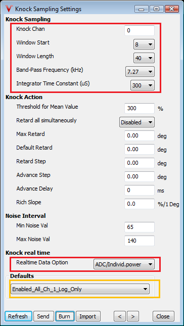 Below you find an example of the knock settings dialog as it is available in inputs/knock sampling in VemsTune. The variables which are needed for the setup knock action are highlighted in the green rectangle. Included are safe defaults for the knock action variables, these are also available in the default "Enabled_All_Ch_1".