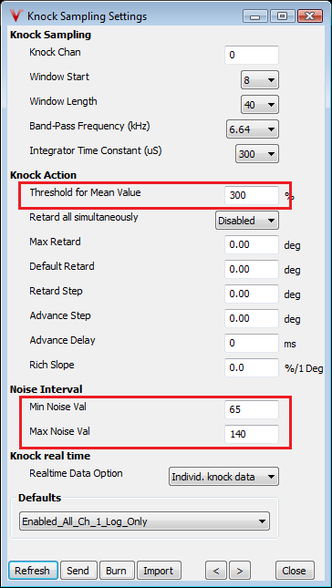 Threshold for mean value: this is a scalar, which is multiplied by the mean value to determine knock 300% should be a safe value to start, if you want to detect knock earlier (mean based) lower this although values lower than 250% are not recommended, valid good range 250-400%.