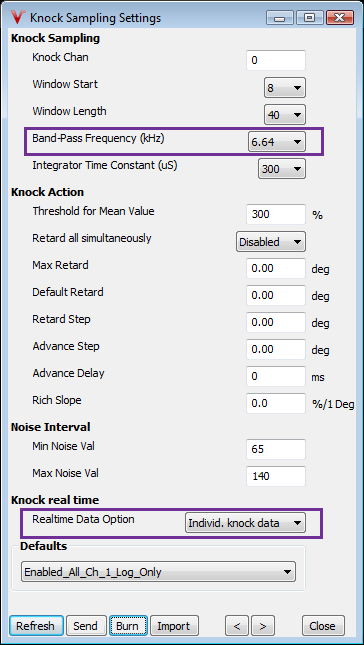 Before starting the actual calibration process you need to calculate the knock frequency for your engine bore and select this in the band pass frequency dropdown. For proper setup of gain levels also need to make sure that in the dialog inputs/knock sampling settings, section "realtime data option", the option individual knock data is selected (bottom red box from the dialog of previous section). Updated dialog with settings for our example engine (highlighted in purple).
